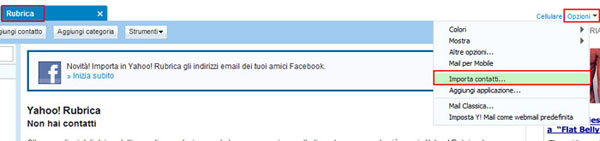 1. Una volta aperta la propria Yahoo mailbox, andare su "Rubrica", e sulla destra cliccare il menù "Opzioni", quindi selezionare dalla lista la voce "Importa Contatti...".